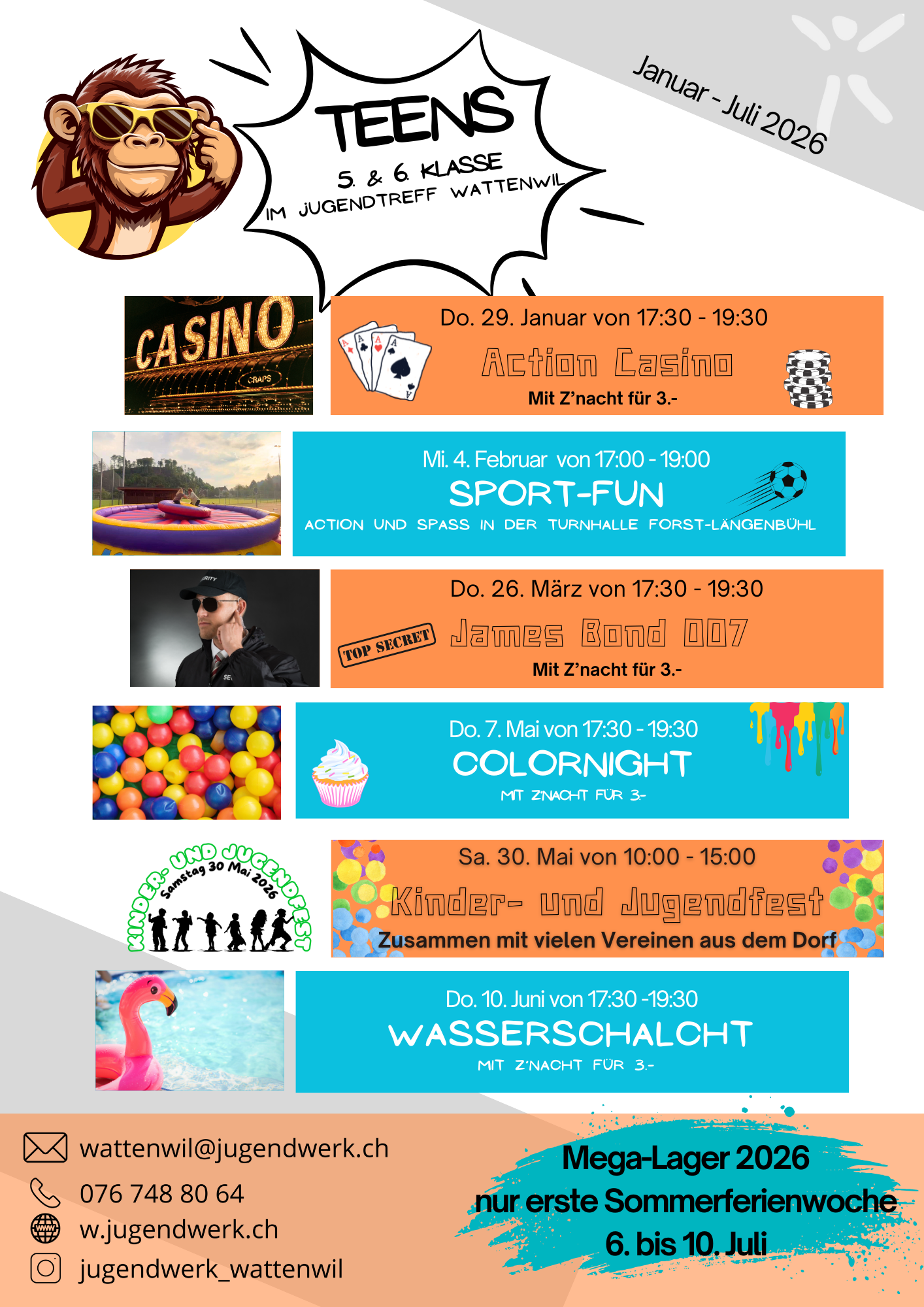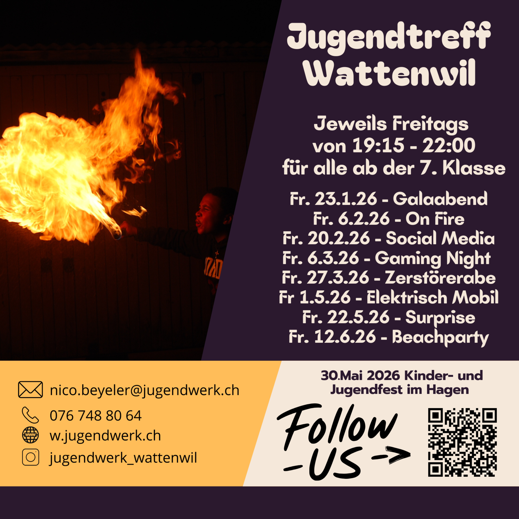 14 Vereine und Organisationen aus Wattenwil und Umgebung organisieren am Samstag 30. Mai 2026 ein Kinder- & Jugendfest. Ziel ist es, Kindern, Jugendlichen und Familien einen erlebnisreichen, spannenden und verbindenden Tag zu ermöglichen – und gleichzeitig den lokalen Vereinen und Organisationen eine Plattform zu bieten, sich der jungen Generation und ihren Familien zu präsentieren.