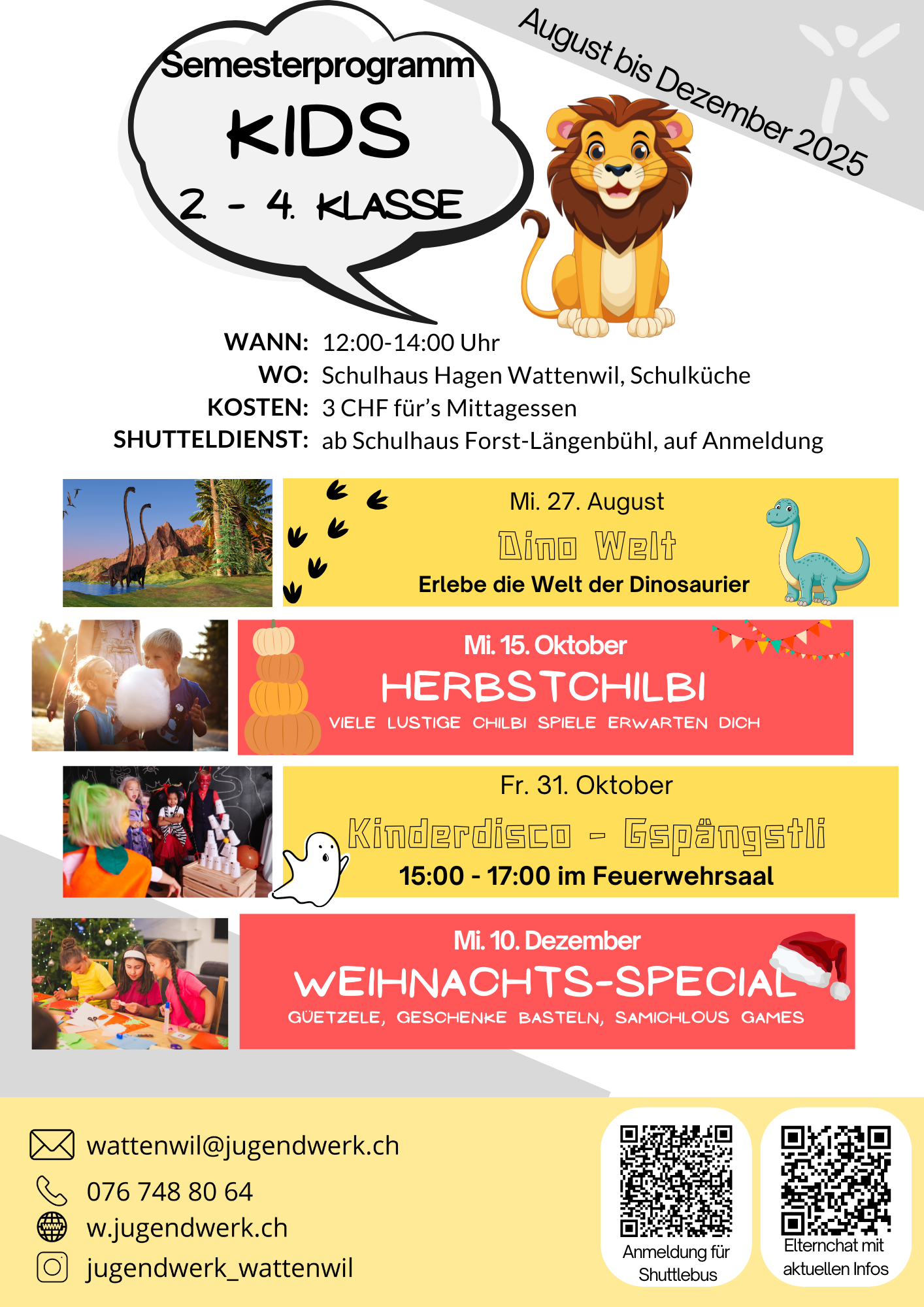Für die 2.-4. Klasse findet rund sechs Mal im Jahr ein Kids statt. Das Angebot wird im Hagen Schulhaus von 12.00 bis 14.00 Uhr durchgeführt. Für das Mittagessen kostet das Kids pro Teilnehmer 3 CHF.