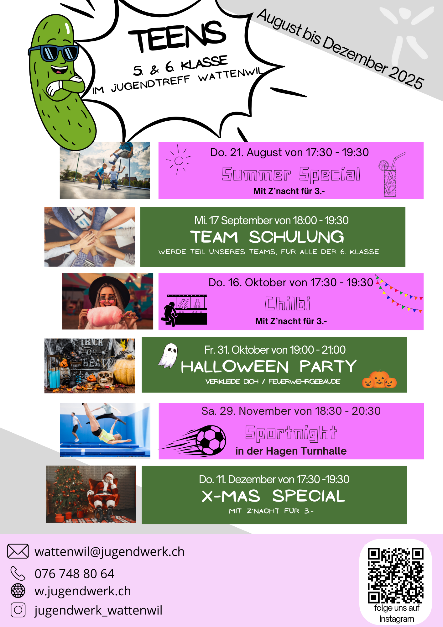 Das TEENS findet rund einmal im Monat am Mittwochabend im Jugendtreff statt. Das Angebot richtet sich an die 5. & 6. KlässlerInnen. Das Teens geht von 17.30 bis 19.30, für 3.- gibt es Abendessen.